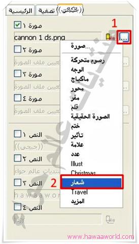 نقوم باختيار (النص 1) أو (2) وعندنا 4 نصوص تمككنا من كتابة أربع خيارات جاهزة للكتابة على الصورة..