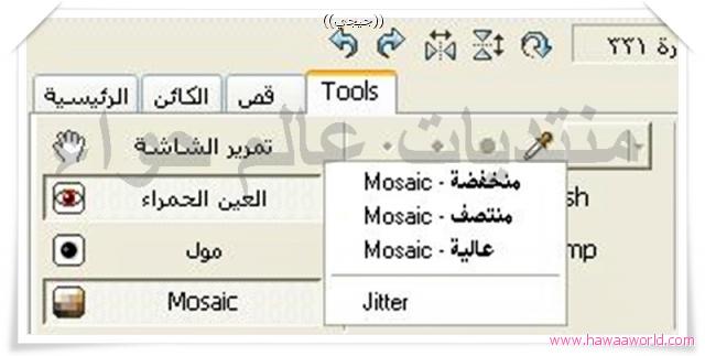 4- mosaic: وهو لعمل تمويه على الصور.. كما نرى أحيانا صور في الجرائد وقد موهت العينين.. أو الوجه كاملا..