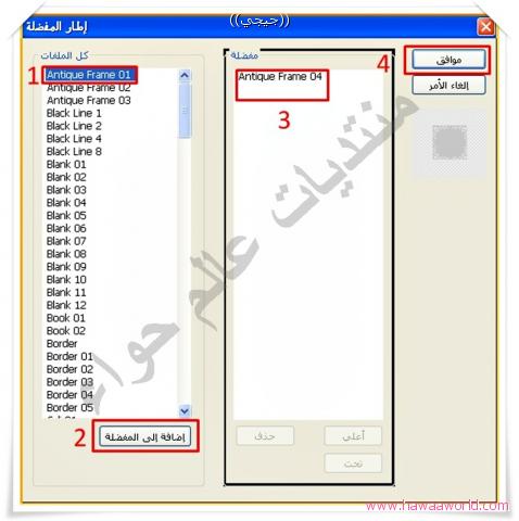 عند الضغط عليها يمكنك تحديد عدة إطارات مفضلة ووضعها كاختصار عند اختيار إطار معين.. بحيث لا يحتاج أن تمرين على جميع الإطارات الموجودة وإنما تكتفين بفتح المفضلة واختيار إطاراتك المحببة.. كما في الصورة..