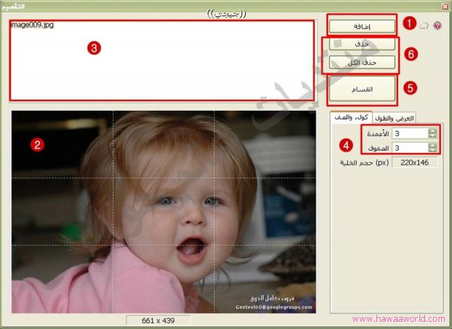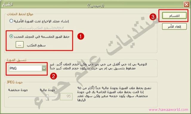 يقوم هذا الخيار بتقسيم الصورة إلى عدة أجزاء مختلفة.. ويحفظ كل جزء على حدة، بحيث يمكنك الاستفادة من أحد أجزاء الصورة دون الآخر، كما يمكنك التحكم بعدد الأعمدة العمودية والأفقية للصورة..
