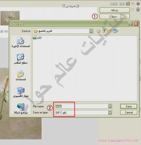 2- اختاري مكان الحفظ وسمي الصورة.. وتأكدي أن صيغة الحفظ هي (GIF) فهي الصيغة الخاصة بالصور المتحركة..