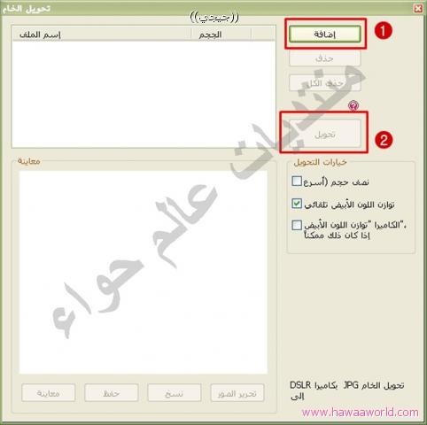 1- افتحي أيقونة (تحويل الخام) ثم اضغطي على (إضافة).. وحددي جميع الصور المراد تحويلها واضغطي (فتح)..
