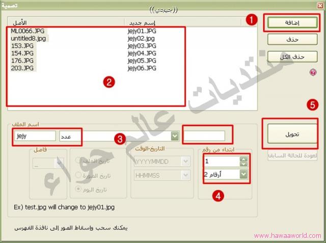 هذا الخيار يمكننا من خلاله إعادة تسمية الصور بالتسلسل حسب ما نريد بالاسم أو الرقم أو بهما معاً، أو بالتاريخ أو الوقت.. عدة خيارات متاحة مريحة جدا..