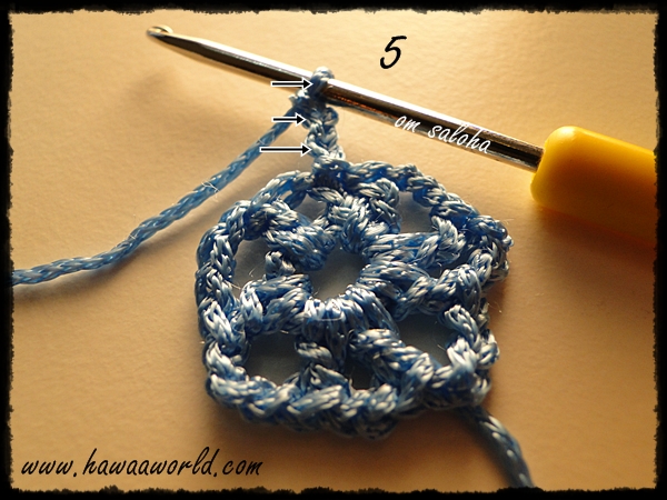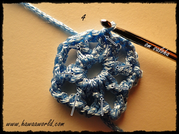 أنتي الآن في الدور الثالث وثبتي العامود في ثالث سلسلة في الدور الثاني إصعدي أربع غرز سلسلة ثم ثلاثة عامود في السلسلتين إلي في الدور الثاني ودخليها من حولها وليس من داخلها ثم صلحي ثلاث سلاسل ثم ثلاث عامود في نفس المكان إلي صلحتي فيه الأعمدة الثلاثة الأولى وكملي ثلاث سلاسل وثبتي بغرزة حشو في السلسلتين التي في الدور الثاني ثم صلحي ثلاث سلاسل ثم كملي