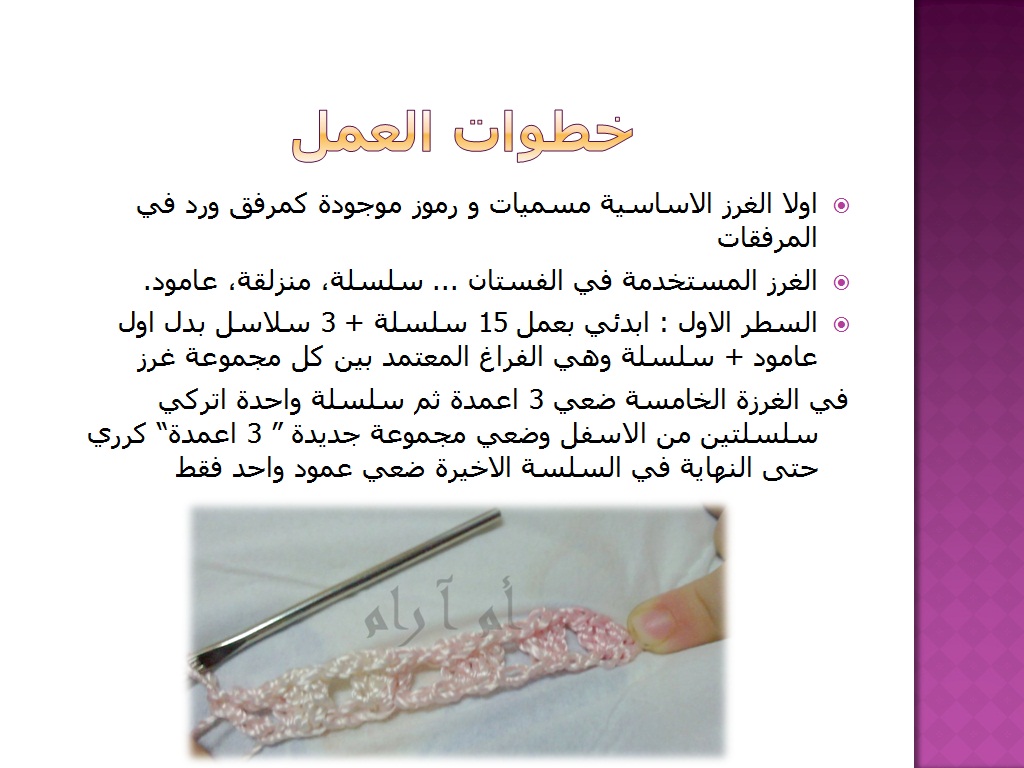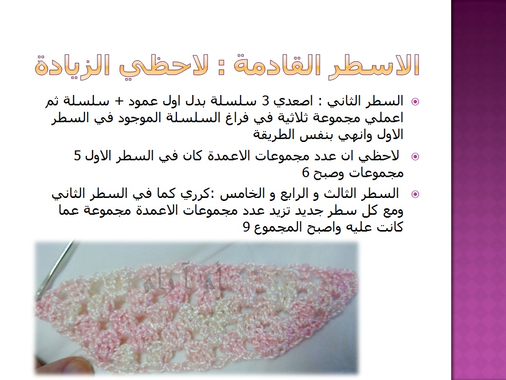عندي ملاحظة يا بنات انا مو دبة ومقاسي تقريبا 40 مع الحمل لهلا زدت بس 4 كيلوا و الغريب ان الفستان مقاسمه ملائم جدا ما بعرف اذا الخيوط هي السبب الحرير ارفع من الديفا والديفا بياخد حجم اثناء العمل الملاحظة الثانية كلما كانت السنارة ارفع كلما صغر العمل وهاي المعلومة ممكن ما بيعرفها الجميع السنارة الاصغر تشد الخيوط وتصغر المقاس نصائح تصغيير المقاس راح ارفعها اليوم ان شاء الله نسمة احنا حددنا الظهر ب 17 مجموعة لان هذا الجزء من الصدر حيكون مقابل للسطر 13 من الصدر فلازم يكون مساوي له واذا ما كان مساوي له اخاف الجناب ترجع لورا ... يعني تخيليها مثل خياطة فستان القماش مش الحبكة بتكون ع الجوانب اذا الصدر اوسع بكثير من الظهر من الحبكة ترجع للخلف بدل ما تكون في موقعها الطبيعي الجوانب هلا نيجي للغلط في الصورة بما انه ابتدى الظهر من السطر 13 حتلاقينا ختمناه عند السطر 19 فيما الصدر لسه عند السطر 18 لذا اول مرة بنشبك فيها مع الصدر لازم ما نشبك بمنزلقة وانما كاننا بنشتغل سطر جديد عشان هيك انا قلت مجموعة ثلاثية يعني حتلفي ع السنارة خيط وتشتغلي ثلاث اعمدة في اول فراغ بلاقيك عن الصدر بس تختمي السطر كاملا حيكون عدد سطور الصدر = سطور الظهر فحتشبكي مباشرة بمنزلقة من الجانب الاخر " على فرض عم نعمل تدييق ونقصنا سلاسل تحت الابط ما فهمت بالضبط قصدك بدايات الظهر يعني شي ثلاث اسطر بالحشو و بعدها تشتغلي من السطر الثاني للاسطر الظهر ممكن بس برضوا مو متخيلة النتيجة ^_^ اذا عملتي هيك خبرينا شو بصير معك هلا يا قمر شوفي فين الخطا انك ما بتبتدي كل سطر وتنهيه كما هو مطلوب بداية السطر ونهاية واحدة لازم تكون مكونة من 3 اعمدة سلسلة ثم 1 عمود عندك اسطر كثيرة تم انهائها بعمل واحد عمود فقط وبم تسبقها مجموعة من الاعمدة الثلاثية لاحظي هنا معلم عل معظمها بالسهمعندي ملاحظة يا بنات انا مو دبة ومقاسي تقريبا 40 مع الحمل لهلا زدت بس 4 كيلوا و الغريب ان الفستان...