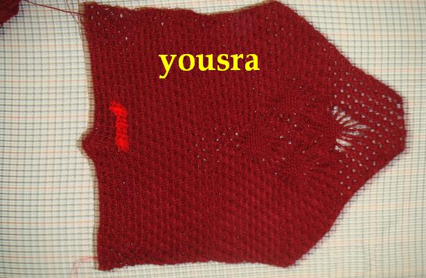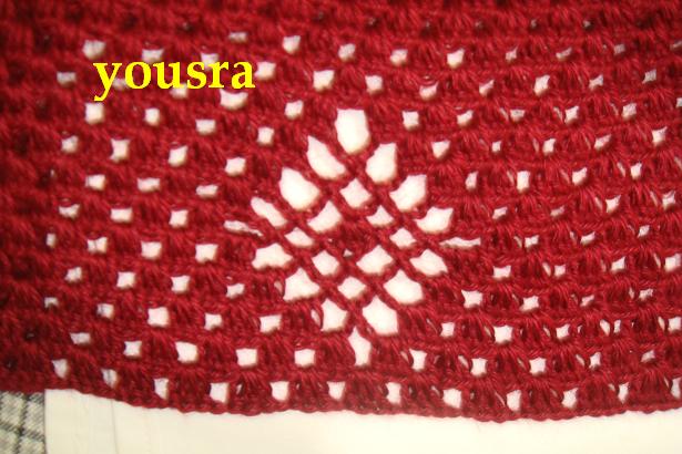 انا اقترح ان تشتغلي بالسنارة ذات المقاس الاصغر وخاصة ان الغرز كانت فيها ارتب وزيدي عدد السلاسل الموجودة تحت الابط من 6 الى 12 مثلا وما في مشكلة لو زدت عدد مجموعات الاعمدة الثلاثية بس الزيادة تكون زوجية و العدد الكلي فردي