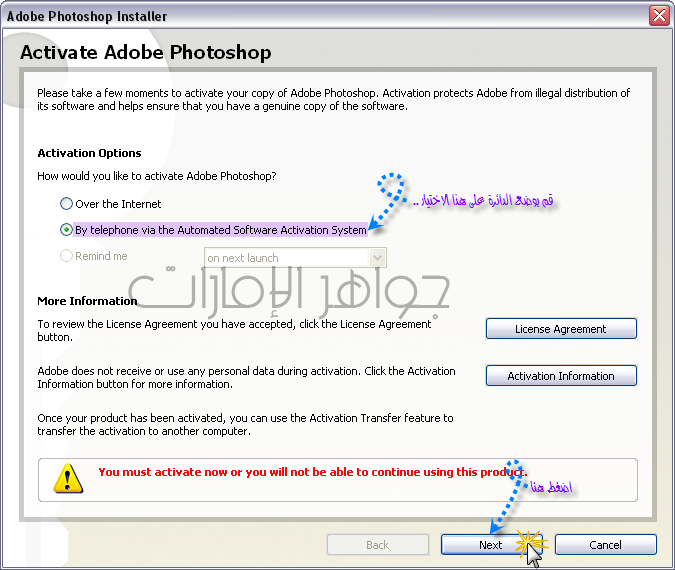 إذا مو عندك أفتحي الفوتوشوب وروحي قائمة هيلب آخر قائمة واختاري activation