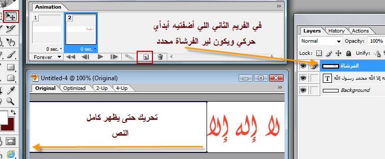بعدين حددي أداة التحريك ولير الفرشاة وأضيفي فريم جديد بعدين حركي بالاسهم لليسار لين يظهر النص كامل