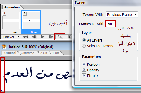 بعدها تختاري tween وتحطي عدد الفريمات اي رقم تبغيه انتي