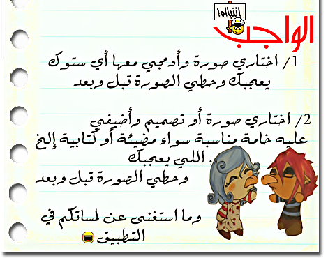 1- يكون كامل يعني مو مجرد لصق صورة بخلفية ,, نفس تصاميم وتطبيقات الدرس , تصميم كامل استخدمي (صور أطفال, ستوكات, خامات, فلاتر, اكشنز, وحتى لو تضيفي تاثيرات من عندك سوي اللي يعجبك أهم شيء يكون تصميم كامل وطبعا عليه كتابة وأقصد بالكتابة يعني انت تكتبي نص مو تحطي خامة كتابية وطبعا يفضل عربي