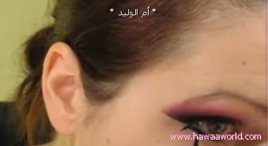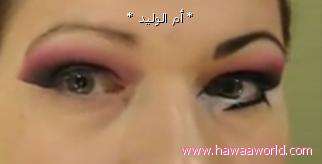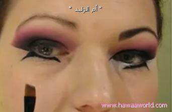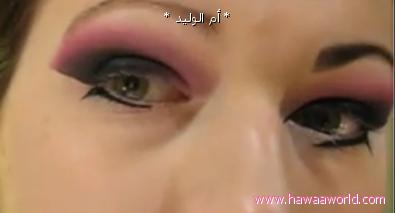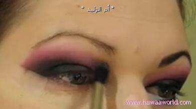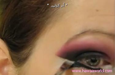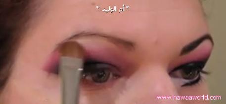 نضع اللون الزهري على اطراف الظل الاسود عن طريق الطبطبه الرقيه و يكون خط خفيف على حسب مساحة الجفن و شكل العين