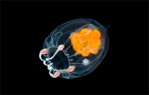 أحد الحيوانات البحرية ملأ معدته بالطحالب الخضراء التي نراها واضحة من خلال هذه الصورة.