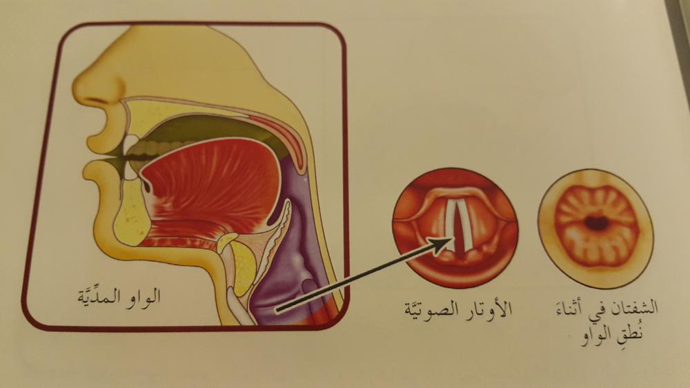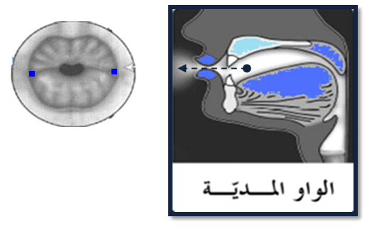 - وعند النُّطق بالواو تقترب مقدّمة اللسان من الأسنان السّفليّة، وترتفع مؤخّرته وترجع إلى الوراء،ولكنّها لا تلامس الحنك اللحميّ، وتبقى فرجةً صغيرةً لخروج الهواء، كما يبقى الصّوْت متّصلاً لعدم وجود عائقٍ يقطعه، ويكون معترضاً(متوسطاً)، ولا بدّ من ضمّ الشّفتين عند النُّطق بالواو.