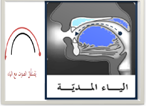 - وعند النُّطق بالياء يكون رأس اللسان عند الأسنان السّفلى، ويعلو اللسان في منطقة الوسط، ولا يوجد أيّ اعتراضٍ لهواء النّفَس يقطع الصّوْت. وعند النُّطق بالياء يكون الصّوْت منخفضاً لانخفاض الحنك السّفليّ.