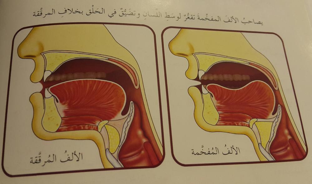 عند النُّطق بالألف ينفتح الفم ويتصعّد الصّوت نحو غار الحنك، ويكون اللسان أسفل الفم بمقدّمته ومؤخّرته، أي في وضع الرّاحة.