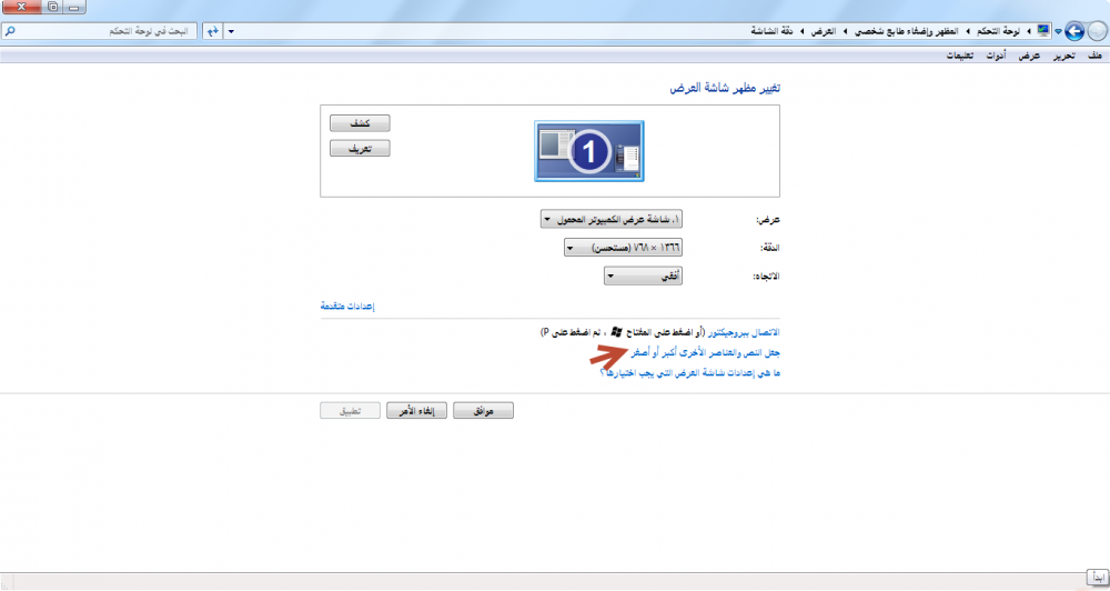 اضغطي بز الفارة الايمن على سطح المكتب واختاري دقة الشاشة