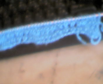 السطر الثاني: كرر السطر الرابع. كرر أخر سطرين 6(6-5) مرة أخري . اسلت الغرز الباقية 6(6-8) غرزه على إبرة أخرى