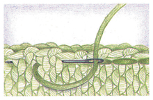 ارجعي بالابره واغرسيها في الغرزه السابقه وبعدين طلعيها علي بعد نص سم تقريبا للامام وهكذاخيطي في خط مستقيم