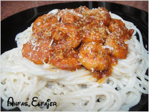 ٥. للتقديم، تسكب المكرونة في قعر الطبق ثم يضاف مزيج الجمبري والصلصة الحمراء فوقها ويرشّ جبن البرميزان على الوجه. يقدّم الطبق ساخناً.