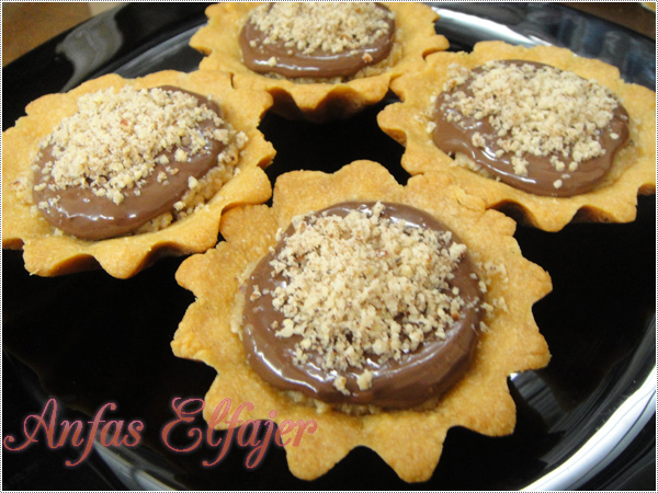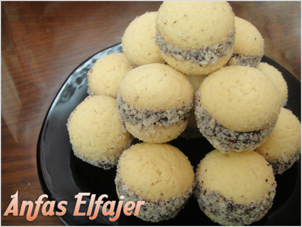 تترك لتبرد ثم تغمس قاعدة احدى الحبات في صوص الشيكولاتة وتلصق جيدا بحبة أخرى وتقلب في البندق المفروم من مكان اللصق حتى يلتصق بها