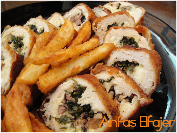 2 . تلف صدور الدجاج جيدا مع الضغط الرقيق وتغلق لتحصلي على شكل اسطواني