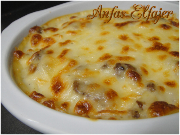 5 . يصب فوق الوجه باقي مقدار البشاميل ويساوى السطح ثم تخلط أنواع الجبن وتوزع على السطح بالتساوي