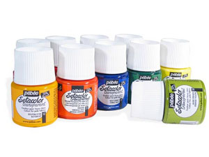 انا شخصيا استخدم ألوان Setacolor حيث انه يصلح لجميع الانسجة الفاتحة والناعمة والسميكة وذات الالياف الطبيعية والصناعية ومتوفر بجميع الالوان ، ثبيت اللون يكون بالكي على القماش من خلف او وضع منديل على الرسمة حتى لا يكون الكي مباشرة على اللون .