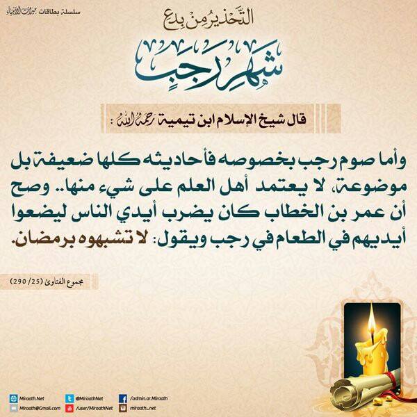 ( وأما الأحاديث الواردة في فضل رجب، أو فضل صيامه، أو صيام شيء منه صريحة؛ فهي على قسمين: ضعيفة، وموضوعة ) الحافظ ابن حجر ـ رضي الله عنه ـ، تبيين العجب بما ورد في شهر رجب، ص33 .( وأما الأحاديث الواردة في فضل رجب، أو فضل صيامه، أو صيام شيء منه صريحة؛ فهي على قسمين: ضعيفة،...