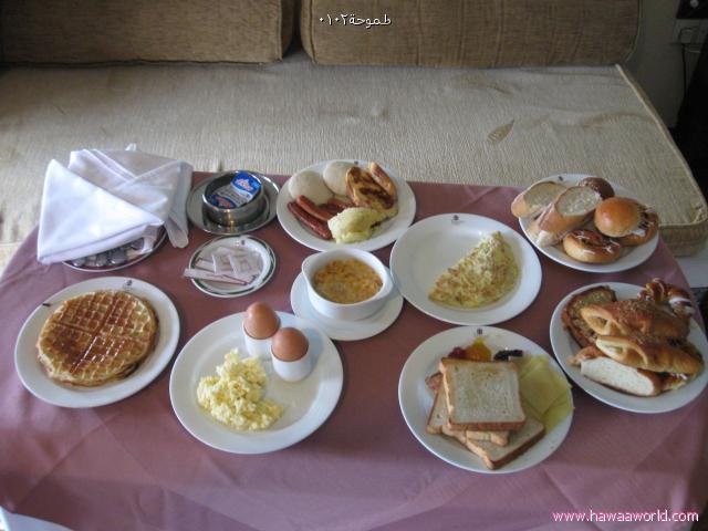 صحيت الساعة سبعه وصليت الفجر وجهزت الشنط وصحي زوجي والاولاد ونزل زوجي واختار الفطور من البوفيه وطلب من العامل انه يوصله الغرفه .....طبعا الفطور كان جدا لذيذ ويفتح النفس وهذي صوره