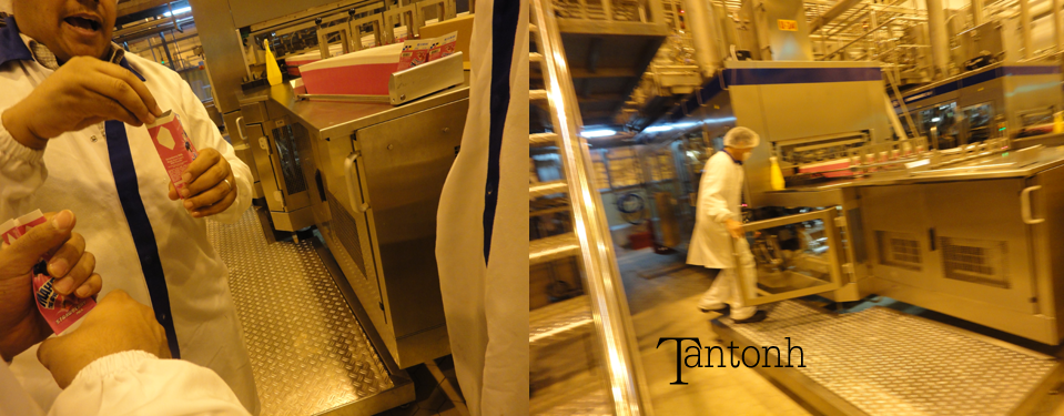 طلبنا ندخل جوا المصنع .. فقالو لازم تعقيم خاص ولبس معين واعداد قليله فطلعنا في الأخير ثلاثه < انا واختي واخوي الملابس معقمه بالغرفة .. حتى الجزمات وانتم بالكرامه لازم تلبس تحتها اكياس معقمه و غطاء للشعر .. وبالطو معين .. وآهم شيء قبل لا تنزل للمصنع تغسل يدينك بمعقمات معينه .. الشغل مرتب ونظيف .. شيء مبهر والله .. ما ششاء الله واثناء ما العصيرات تتعبى قال المرشد خذو عصير طبعاً أخوي سحب واحد وتلقائياً جاء يفتحه .. لكن المرشد رفض بحجة ان المكان معقم وما يسمح يختلط مع منكهات اخرى < المرشد وهو يتكلم عن طبقات الكرتون وكيف ان عددها سبعه .. وآي خدش جواتها ممكن يخلي المنتج يخرب بعد ثلاث شهور من تصنيعه يعني سالفة طويل الأجل أصعب شيء .. الحمد لله خلصنا من قسم المصنع وكان ممتع جدا ورحنا لأخر محطه برحلتنا وهي الضيافه لا خلا ولا عدم دخلنا صاله كبيره وفرشوا لنا السجادات نصلي الله يجزاهم خير وبعدها قلطنا عالغدا شكل العصرات والسفره مره مرتبه ,, ويترأسها حبيب الملايين اللبن خخخ وطله سريعه عالبوفيه وهذي مجموعة منتجات لهم صراحه أول مره أجربها طلعت لذيذه جدا وخصوصا حلى الكاستر وجلي الفراوله..طلبنا ندخل جوا المصنع .. فقالو لازم تعقيم خاص ولبس معين واعداد قليله فطلعنا في الأخير ثلاثه <...