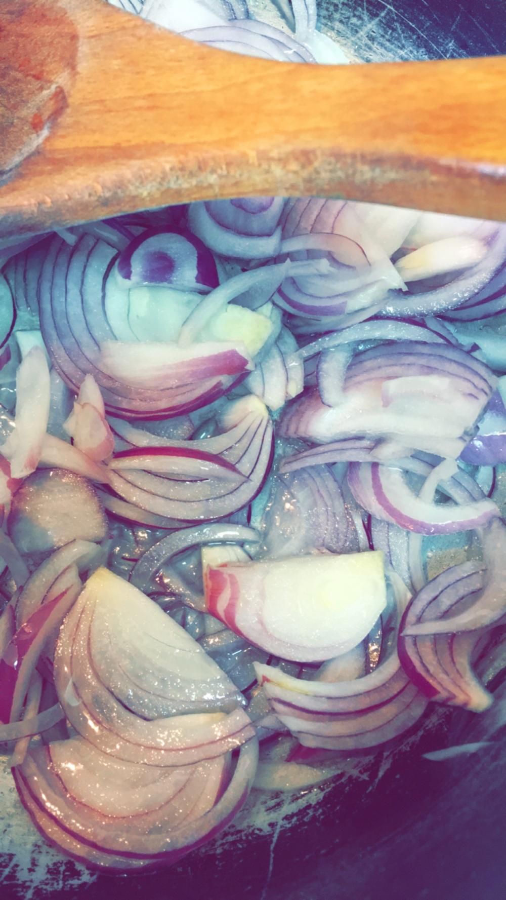 نحمص البصل بالزيت الين مايشقر لوونه ونضيف عليه الثوم والزنجبيل ونقلب