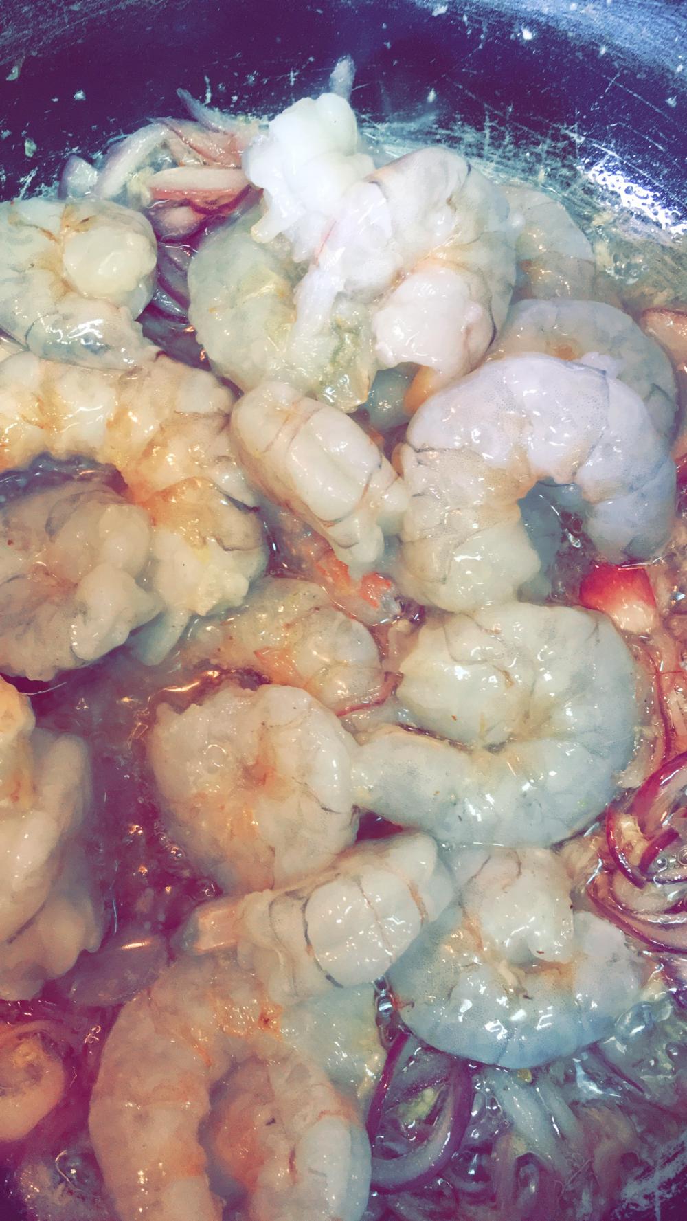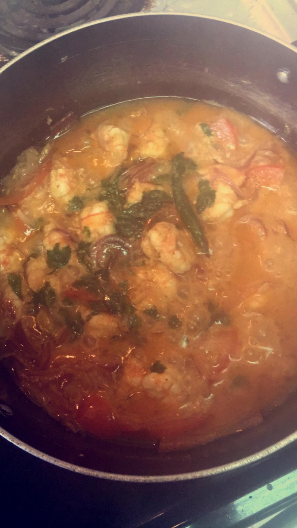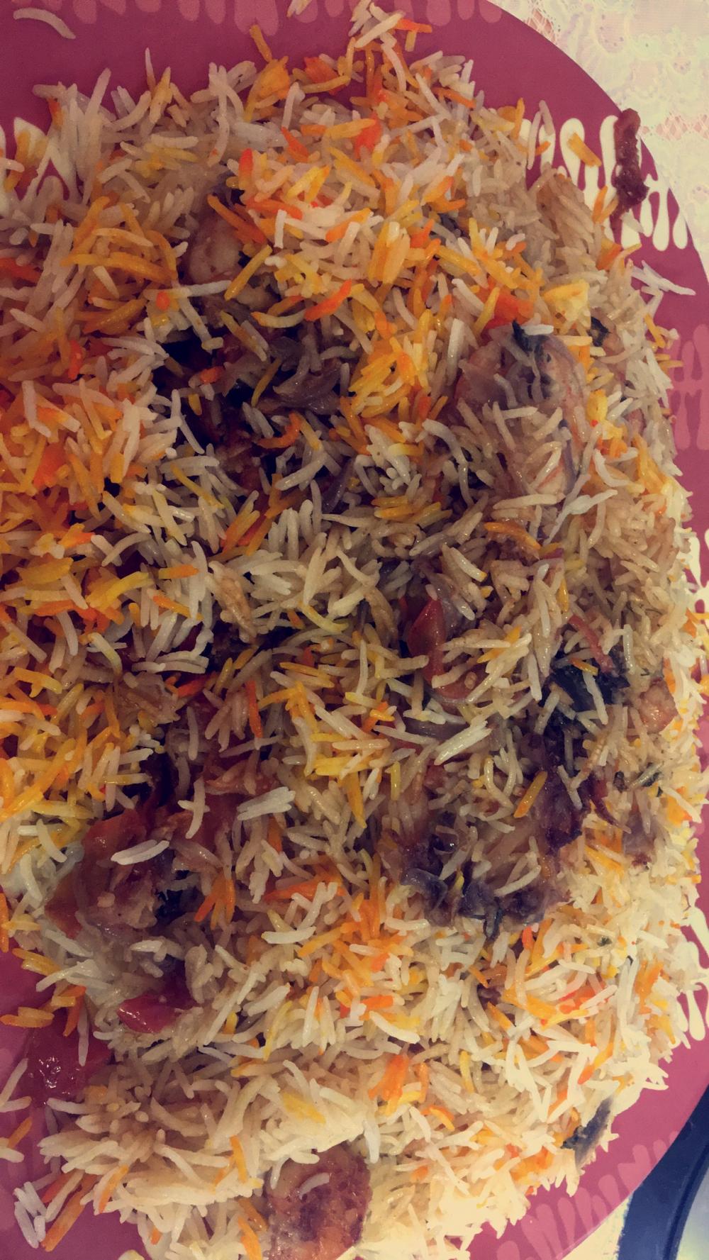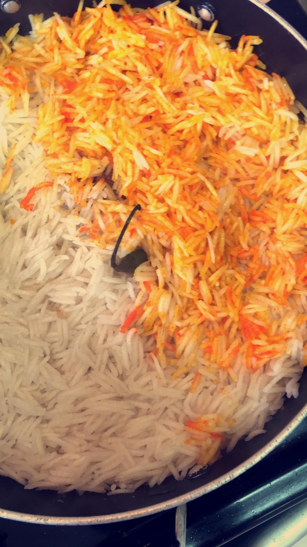 وبعدين نصفيه من مويته ونرمي الرز فوق قدر الجمبري ونضيف الزعفراان والسمن وقفل عليه الين مايستوي الرز ونغرفه