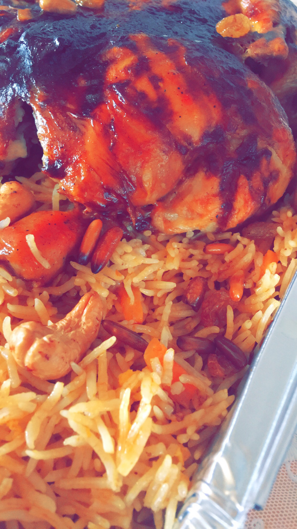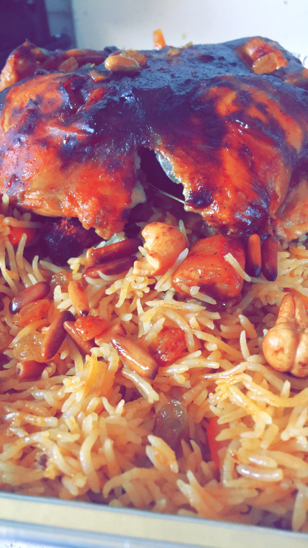 والدجاج نشيله بصينيه وندهنه بخلطه ( زبادي - وصلصله -صبغه زعفران -وملح-وفلفل اسود -وزيت) ونحط زيت بالصينيه وندخلهاا الفرن تتحمر وكل بعد فتره خذي زيت من الصينيه ورشي الدجاج منه الين ماتتحمر وتقرمش