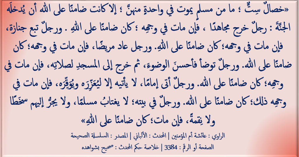 "أنَّ امرأةً كانت عند عائشةَ، ومعها نِسوةٌ، فقالت امرأةٌ منهنَّ: واللهِ لأدخُلَنَّ الجنَّةَ، فقد أسلمتُ، وما سرَقتُ، وما زنَيْتُ، فأُتِيَتْ في المنامِ، فقيل لها: أنت المتألِّيةُ لتدخُلِنَّ الجنَّةَ؟ كيف وأنت تبخلين بما لا يُغنيك، وتتكلَّمين فيما لا يَعنيك، فلمَّا أصبحت المرأةُ دخلتْ على عائشةَ، فأخبرتْها بما رأتْ، وقالت: اجمَعي النِّسوةَ اللَّائي كنَّ عندك حين قلتِ ما قلتِ: فأرسلتْ إليهنَّ عائشةُ رضِي اللهُ عنها فجِئن فحدَّثتهنَّ المرأةُ بما رأت في المنامِ"