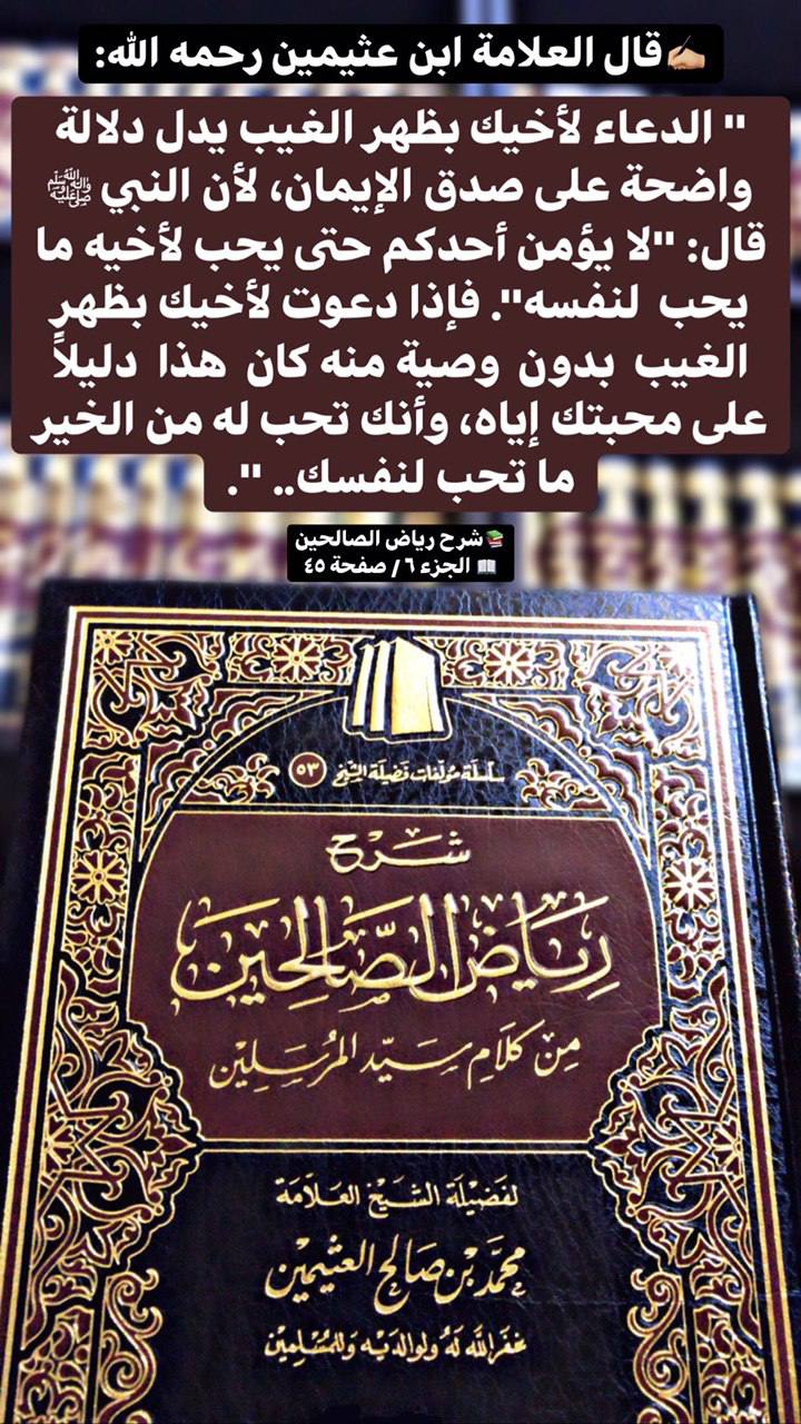 " الدعاء لأخيك بظهر الغيب يدل دلالة واضحة على صدق الإيمان، لأن النبي ﷺ قال: "لا يؤمن أحدكم حتى يحب لأخيه ما يحب لنفسه". فإذا دعوت لأخيك بظهر الغيب بدون وصية منه كان هذا دليلاً على محبتك إياه، وأنك تحب له من الخير ما تحب لنفسك.. ".