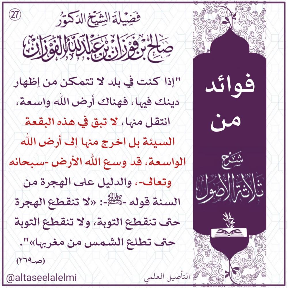"إذا كنت في بلد لا تتمكن من إظهار دينك فيها، فهناك أرض الله واسعة، انتقل منها، لا تبق في هذه البقعة السيئة بل اخرج منها إلى أرض الله الواسعة، قد وسع الله الأرض -سبحانه وتعالى-، والدليل على الهجرة من السنة قوله -ﷺ-: «لا تنقطع الهجرة حتى تنقطع التوبة، ولا تنقطع التوبة حتى تطلع الشمس من مغربها»".