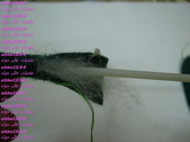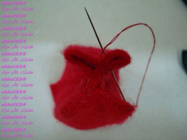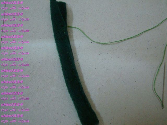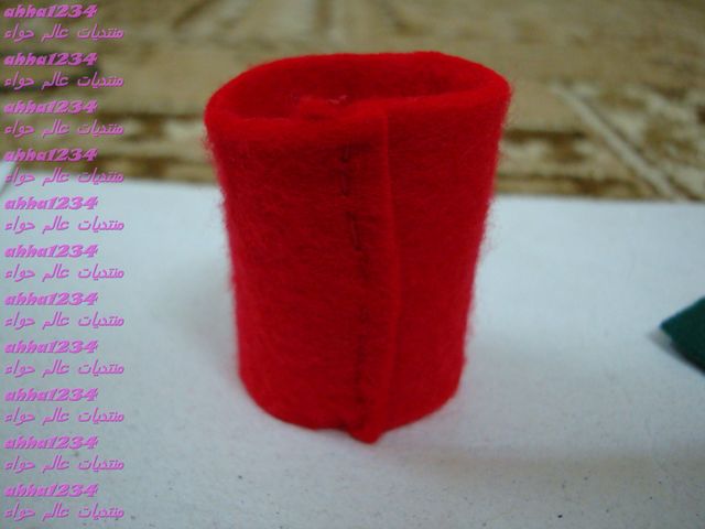 نجيب القطعة المستطيله الحمرا ونلفها بشكل اسطواني ونخيط عشان نقفلها