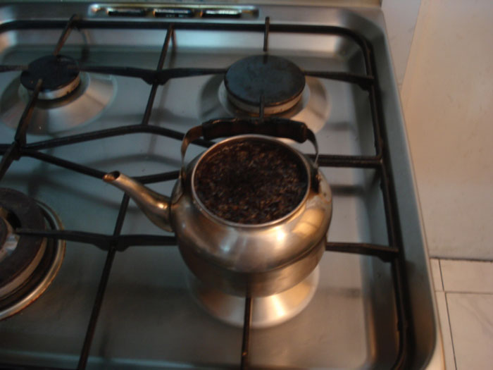 تضعين الماء في إبريق على النار ، ثم تضيفين السكر والماء بارد / وتتركين الماء حتى يغلي وتطفئين النار ثم تضعين الشاي بمقدار ملعقة تقريباً وتتركينه حتى يخدر وبإمكانك إرجاعه على النار فقط غليه واحدة لاتزيدن عليها