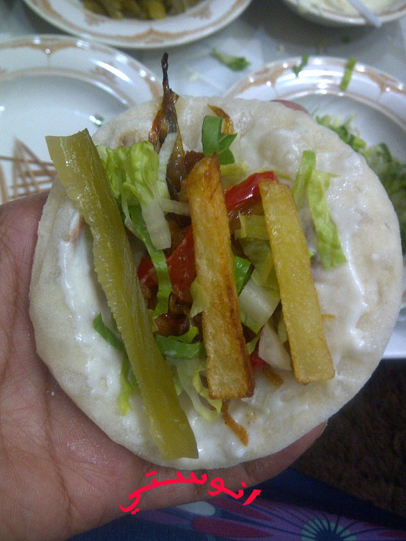 ثم نضع خيار مخلل وبطاطس مقلي وشوي خس