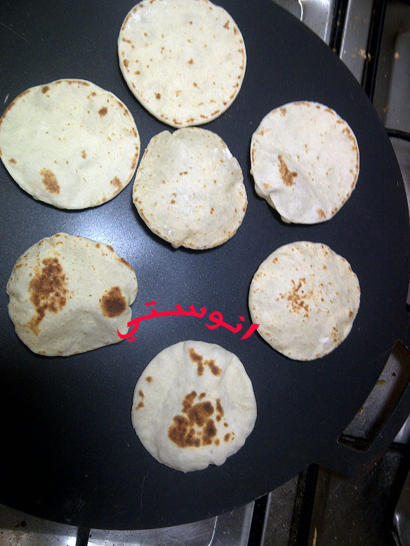 الصاج لازم يكون حامي مرررررررررررره يعني ركبي الصاج على النار قبل الشغل بمدة نص ساعه لازم يكون الصاج حار عشان ينتفش الخبز . ثم نحط الخبز اول ما يطلع فقاقيع من الخبز وينتفخ على طول اقلبه على الجهة الثانية على طول يعني بس يتقمر شوي لون خفيف زي الخبز المقمر بتلاحظين انه خفيف وهش ورطب ولين مره يساعده تسوين فيه أي شكل تبين