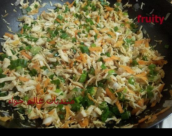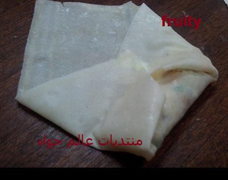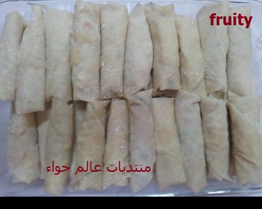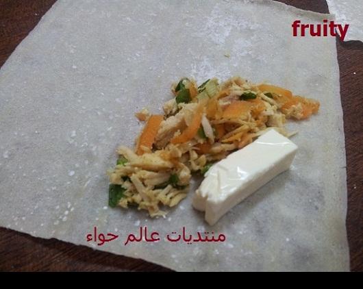 6- توضع الحشوه على السبرنق روول ويوضع معها قطعه جبن كيري واذا بغيتي اتركي نصف الكميه بدون جبن