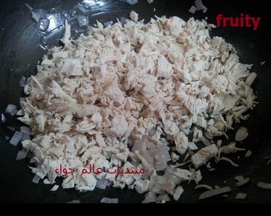 1- يحمس البصل مع قليل من الزيت حتى يشقر