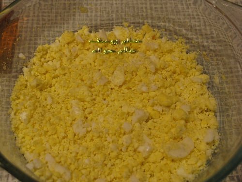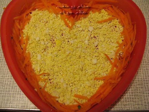 الان احضري قالب و ضعي صفار البيض في القاع و باقي الجزر علي الجوانب