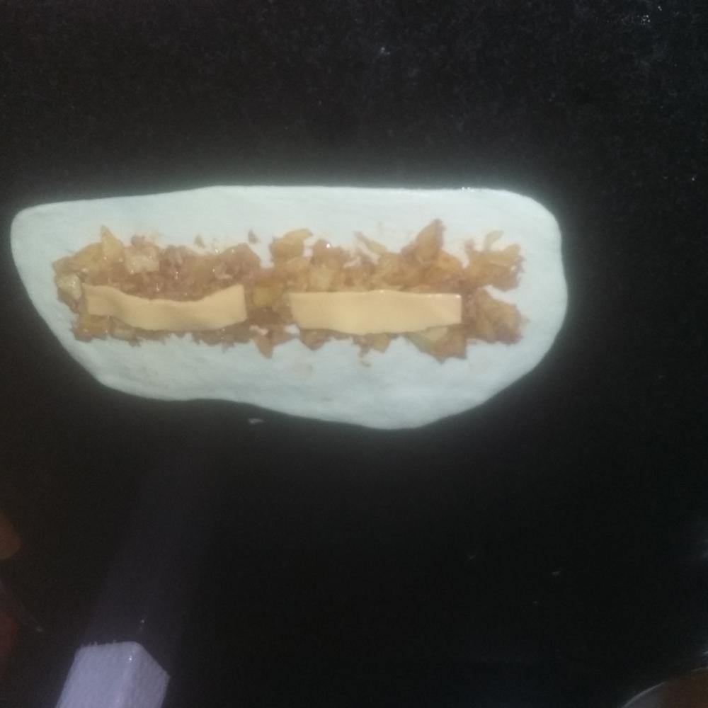 الحشو .. 3 بطاطا مقلية مكعبات ... بصلة كبيرة مذبل بملح و فلفل اسود... علبة تونة مصفية من الزيت.. هريسة ( معجون الفلفل الحار) .. جبن شرائح... بيضة و زيتون للوجه...
