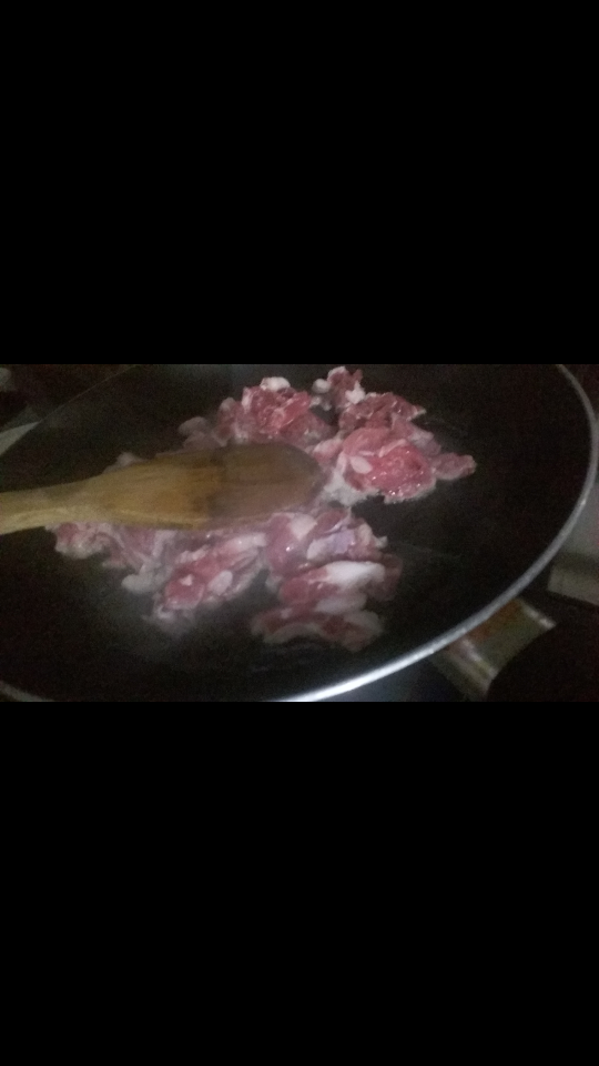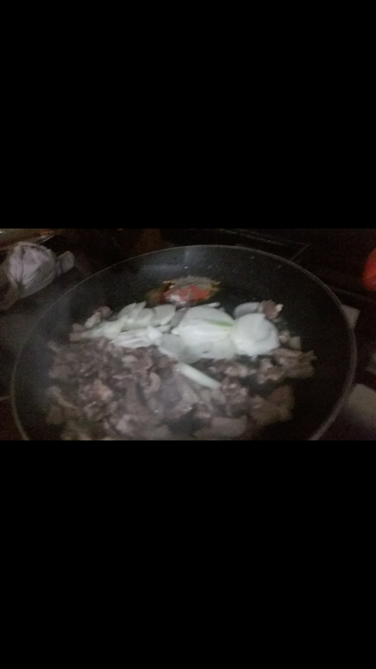 نسخن المقلاة.. نشوح اللحم بالزيت ربع ساعة ثم نضيف البصل و البهارات ...