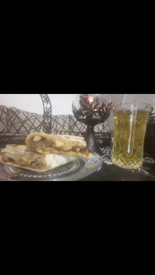 نضع على نص الدائرة الصوص الحار ثم اللحم و البطاطا المقلية و آخر شي الجبن.. و نقفلها و نضغط عليها لين تكتسب لون حلو ...