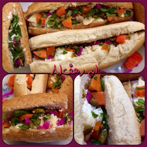 نحشي الصمون بالدجاج ونضع عليه جبن تشدر ونحشي اخر بخلطة الجبن