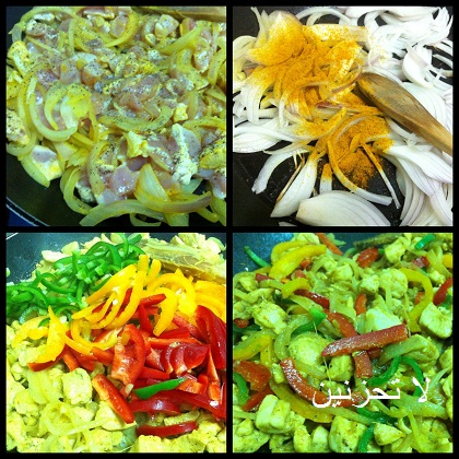 بعد ما يذبل شوي نضيف الدجاج ونقلب مع رشة الفلفل الاسود وشوي ملح حتى يتغير لونها