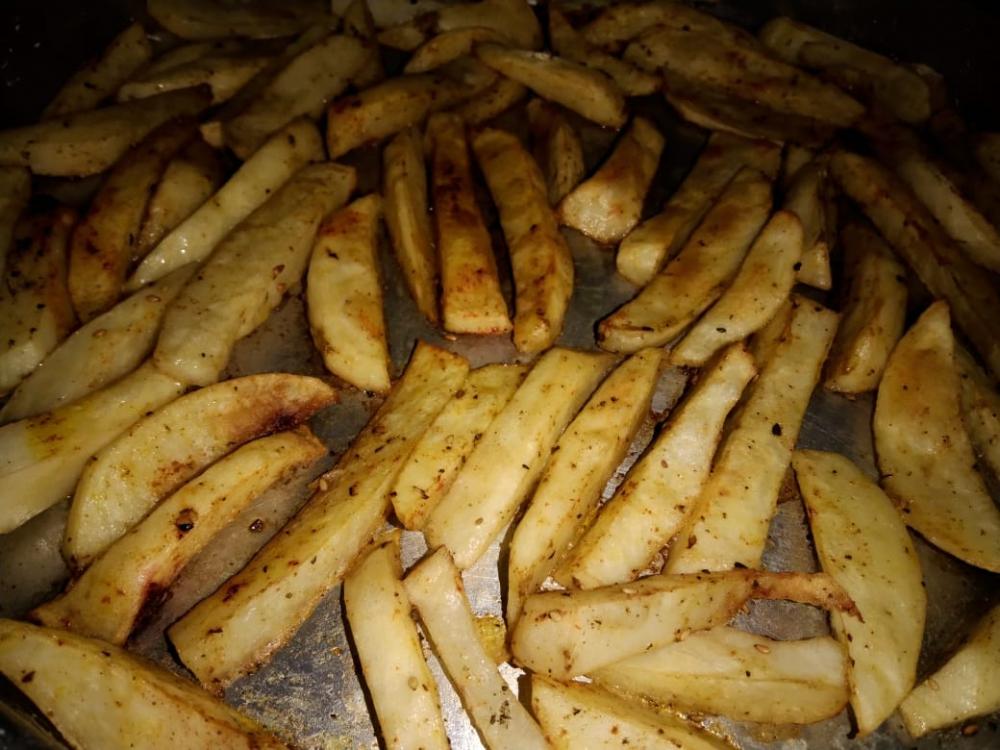 تقطعي البطاطس بذا الشكل ترشي عليه زيت زيتون وملح ورشة فلفل اسود واحمر وبهارات تندوري من شركة مهران وكاري ورشه بصل بودر ورشه ثوم بودر ورشه زعتر وقلبي البطاطس بالخلطه عشان تتوزع البهارات وع الفرن من تحت وفوق