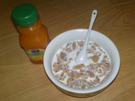 كورن فليكس بالعسل + حليب المراعي + عصير مانجو